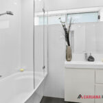 Linen cupboard, full roof cavity attic, modern main bathroom with tub