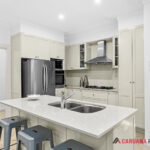 Sleek tile floors, stone kitchen benchtops + breakfast island, gas hob